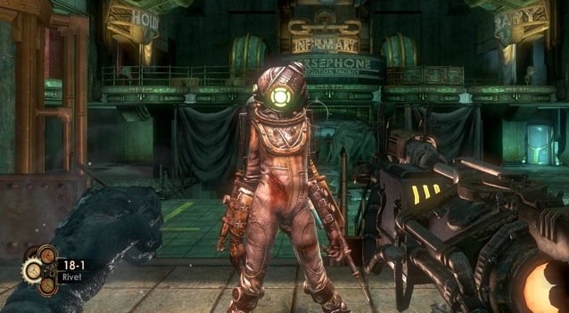 Rarely found apart, the Big Daddy and Little Sister have a touching and slightly horrifying partnership. The Big Daddy is the protector: a genetically modified monster inside an antique, armored diving suit. It usually has a giant drill as one of its arms. It won’t bother you, but if provoked, it will do everything it can to protect its charge and murder you without thought. Little Sisters are a visual contrast: you don’t see other children in the game. Rapture is the not an appropriate venue for anybody, let alone kids. They cutely refer to the Big Daddies as “Mr. Bubbles” or “Mr. B” throughout the game. If you stand and listen, you can hear them sing to their armed escorts, and will mourn their deaths if you take a Big Daddy down. Their purpose is to gather ADAM, a substance that can overwrite a person’s genetic material and give them great power, from dead bodies. It is a trademark of the BioShock series: stark contrasts in expectations and sudden, violent surprises.