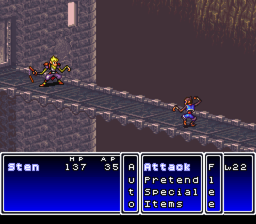 As much as some of the drawbacks are endearingly quaint, like a flawed friend, the Sten scenario is downright unfair. Without warning, you’ll be controlling Sten and Sten alone at one point. It’s very easy to paint yourself into a corner here because you’ll become trapped. If you haven’t leveled him up properly, you’re stuck. You can’t win any battles, let alone the boss encounter and you’ll have to revert to a previous Save Point or restart the game. Ridiculous.