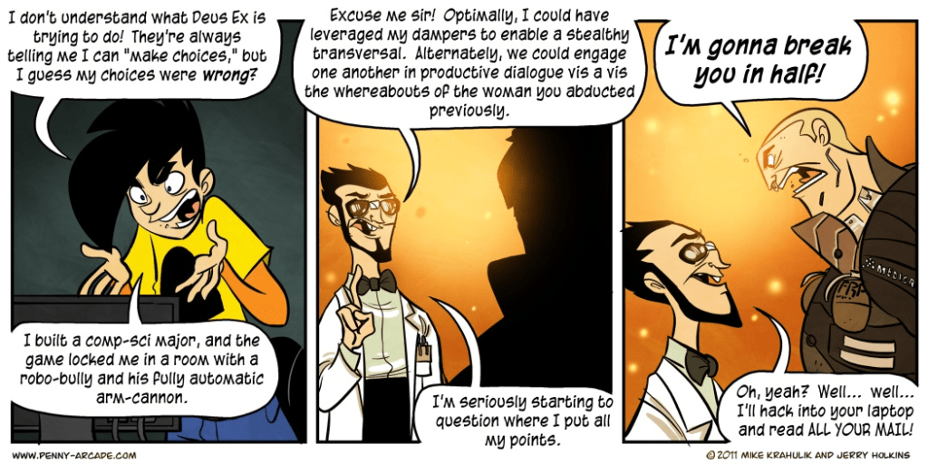 I know exactly the boss they’re referring to. I think it was the first one, and also the hardest in the game. I obviously didn’t spend nearly enough skill points into combat and died a dozen times before cheesing my way through. If a game like Deus Ex: Human Revolution taught me anything, it’s to have multiple saves at multiple points in the game.