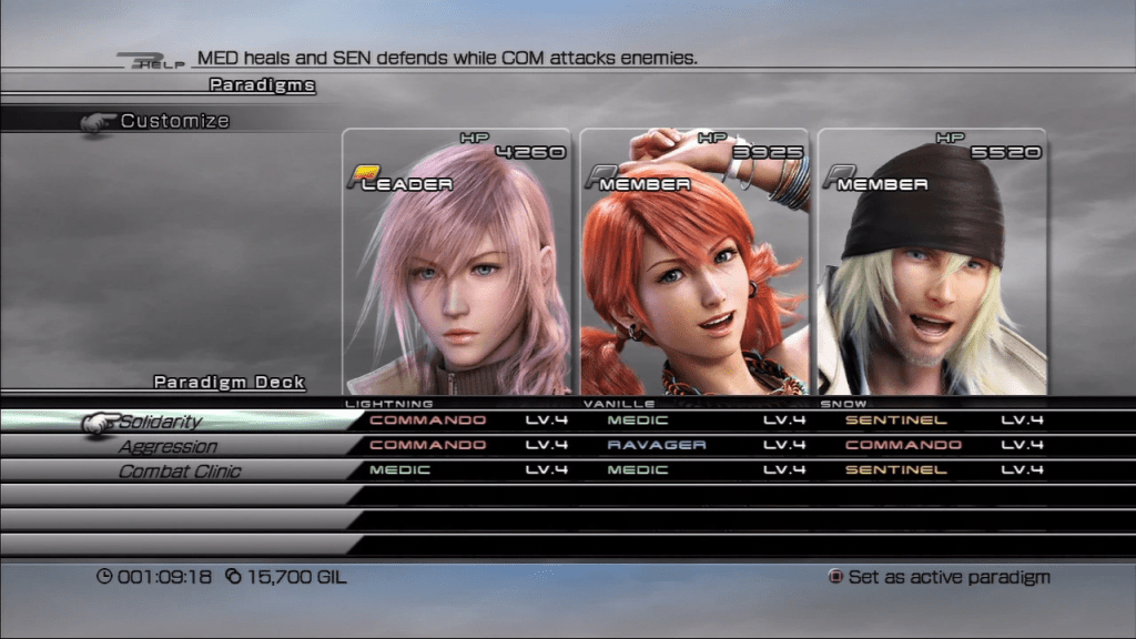 And then their take on the jobs system. I agree that it does take an eternity to open up fully, but when it does, it’s so satisfying. Being able to assign one of six roles to each character means that their spells and fighting style will be altered. You’re allowed a few pre-set formations, called a Paradigm, so you may start out with two of the party members as Sentinels, being able to withstand immense damage without budging, while the third acts as a Saboteur, disabling them with debilitating status effects in preparation for switching all three to become fire-spewing mages. Or for emergencies, two of your characters could be medics. It works. I don’t know if it should, I don’t think it’s for everybody, but seeing the chaos of spells flying and healing only to switch things up with a single press of a button to turn the tide of battle…oof, that got me. It really got me.