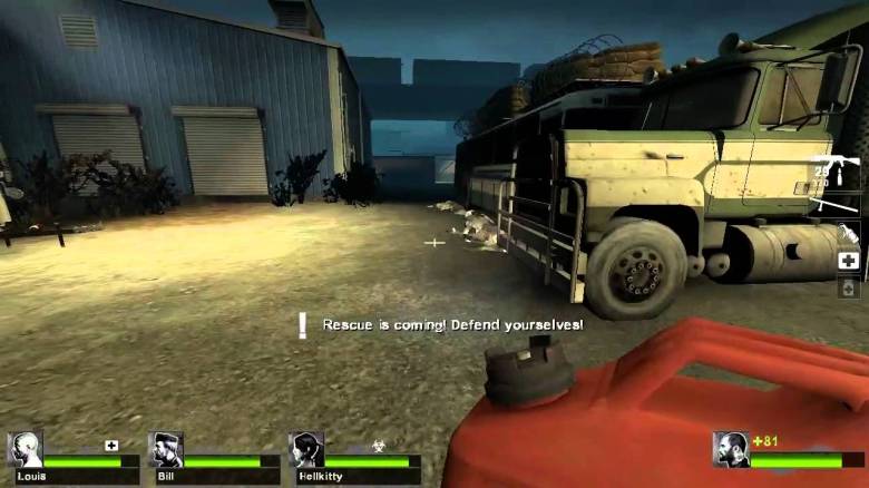 Attempt three: Okay, screw the warehouse. Let’s…hey, can we hop on that truck? Can we? I’m sure we can. Can all four of us fit up here? Yeah, we can. Nowhere for the zombies to drop down into? Check. Height advantage? Check. Nowhere for the zombies to surprise us? Check.