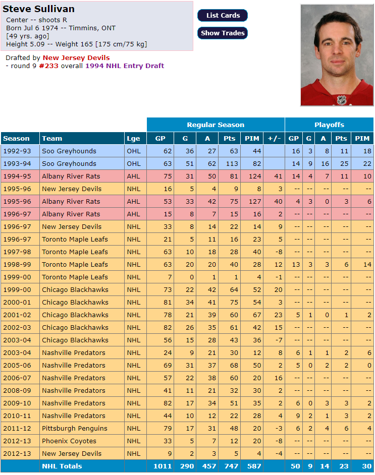 Drafted in the NINTH ROUND (the league only does seven rounds now) in 1994, GMs at the time thought 232 players would be better than him. They look beyond foolish now – every re-draft page I looked at had Steve Sullivan in the Top 20. He went on to accrue 757 points in 1,011 games. Not too shabby.