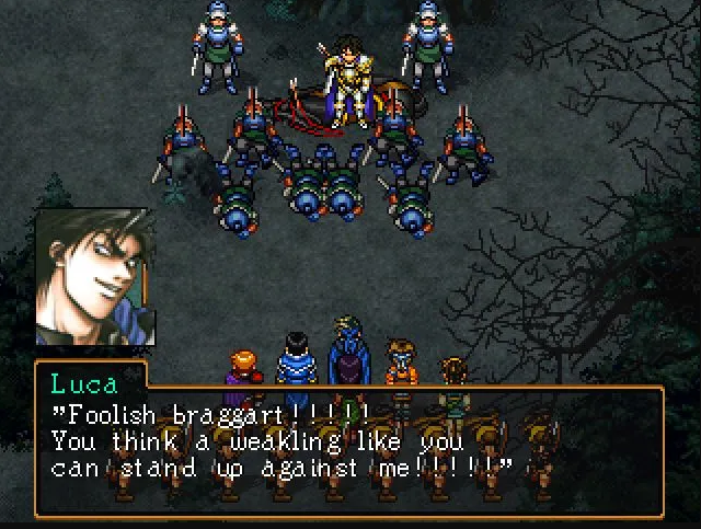 Suikoden II‘s story is excellent. You start off as a junior member in the Highland army with your best friend, Jowy. Something tragic happens to set the wheels in motion, but it’s not predictable. When the villains scheme, no matter how nefarious it is, it makes sense in the world of Suikoden. Refreshing. It’s war. Most cut scenes involve political and military leaders plotting how they’re going to win. The brilliant part is that you see both sides. It’s not The Wire, but it’s a nice change of pace to see the villains also hovered over a table, frantically trying to figure out what to do. Many different personalities come in and out of the picture. And one segment stands above the rest. A highlight, in a game filled with them. It features the deliciously sadistic villain, Luca Blight.