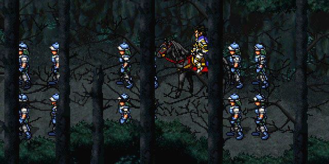 Suikoden II gives you the option of having up to six party members. You take Blight on with five of his cronies; they fall quickly (so hard to find good help these days), and it’s soon six on one. When you deal enough damage, the scene fades back to the woods with Blight staggering away with arrows stuck in him. You don’t let him get away. Your second group of six is waiting and ready for him. Game on.