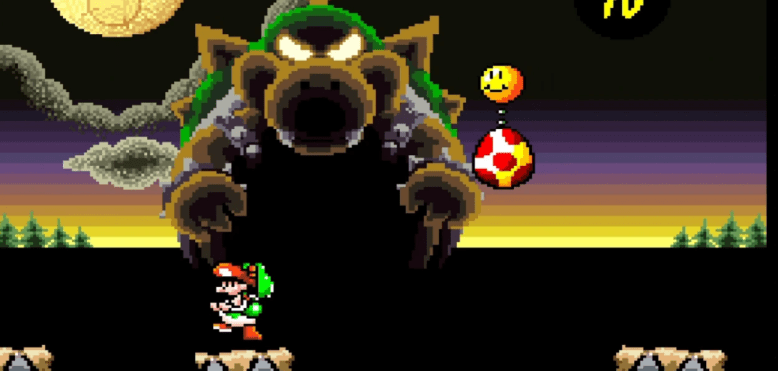 The Mode 7 graphics were really put to work, particularly during the final confrontation. This is STILL the best end boss fight in any Mario game. It’s such a tonal shift from the happy-go-lucky, colorful theme you’re used to. It feels more like an apocalyptic hell as Baby Bowser grows to the size of a small mountain. You have to hurl giant eggs at him on a pseudo-3d plane. It kicks so much ass, and again, that theme makes it.