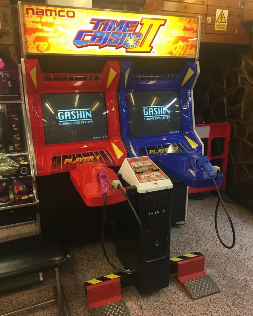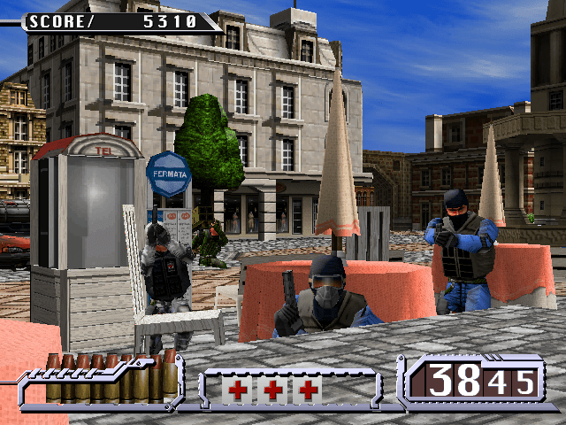 Time Crisis 2 is far more reasonable. There’s a pedal by your foot. Step on it, and you pop out from your cover, clearing the way to shoot the enemies on screen. Release the pedal, and you go back to hiding. As far as I know, you cannot be hurt while hiding. The caveat is that there’s a time limit per screen so you can’t just play turtle the entire time.