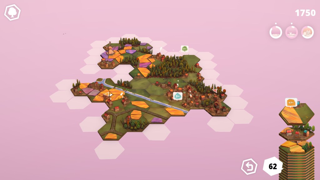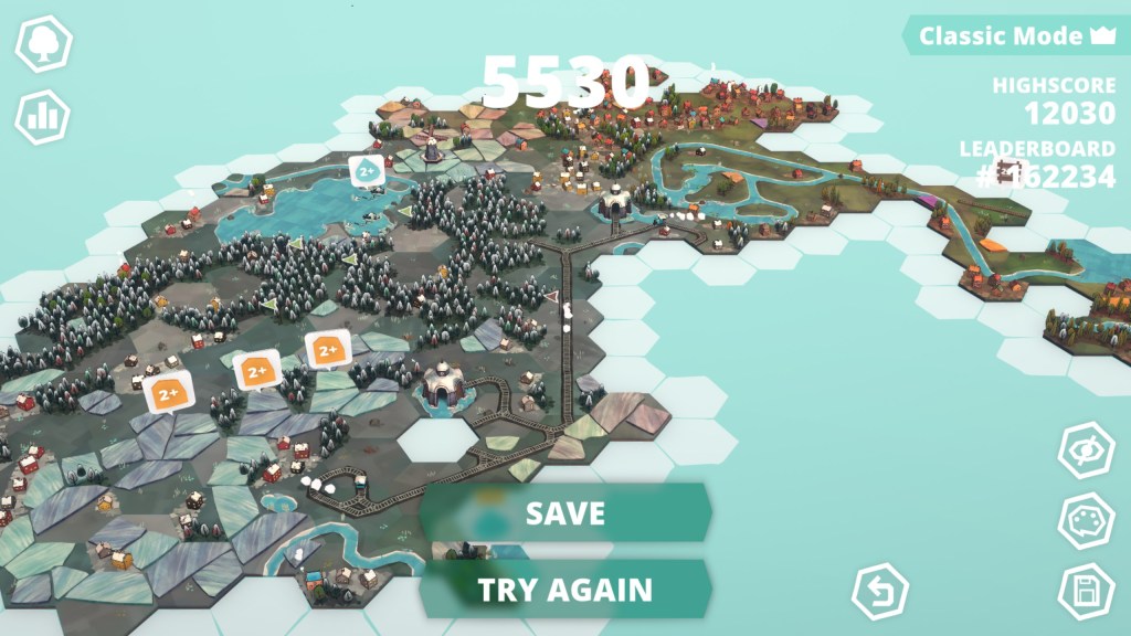 It’s a simple concept, beautifully executed. You play one tile at a time and build your own little countryside village. Each hexagon can contain trees, wheat fields, rivers, houses, railroads and more. Combining them in the right places will ensure you gain more points and access to additional tiles. Game Over happens when you run out of tiles, but I never felt frustrated in the slightest; achieving a goal isn’t really this game’s goal. It’s to sit back and watch the cute little boats traverse your snaking river. It’s imagining living in the little village and hearing the train’s whistle in the background. It’s sitting back and appreciating the tranquility of the ever-expanding town you’re putting together.