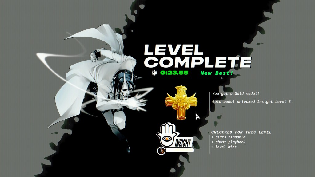 I’ve really never played anything like this. I never felt any frustration. Each successful run flooded my brain with serotonin. The amount of challenge is perfectly suited to nearly every skill level – the main story isn’t overly challenging, but there are optional areas that will test even the most godly of angelic assassins. The soundtrack is ethereal, even now I have some of the tunes stuck in my head, particularly when I get into a flow state of reading, or writing, or arithmeticizing about video games.